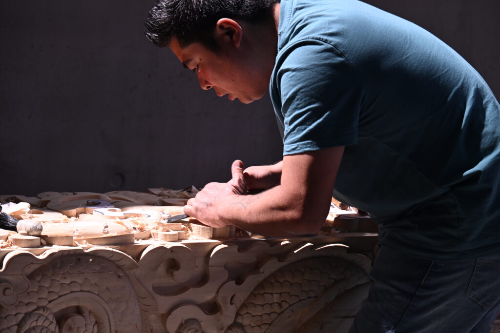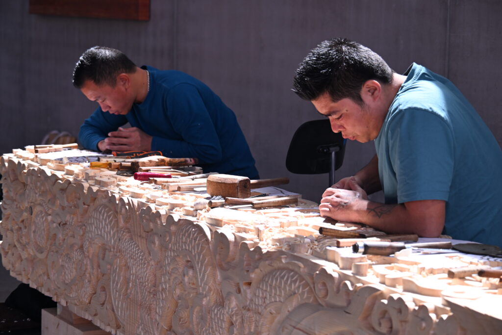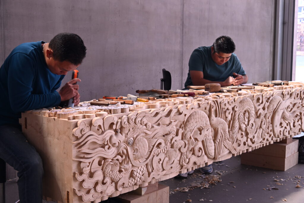 På BIG´s hovedkontor blev limtræet forarbejdet håndlavet af munke fra Bhutan.